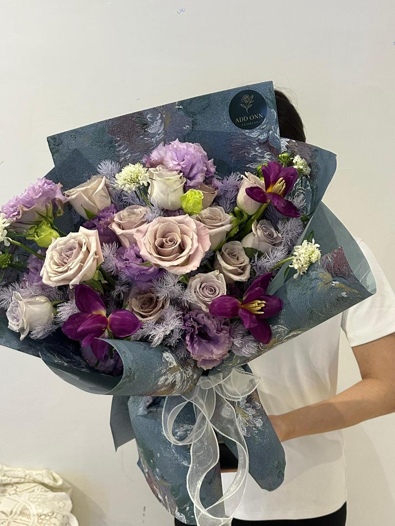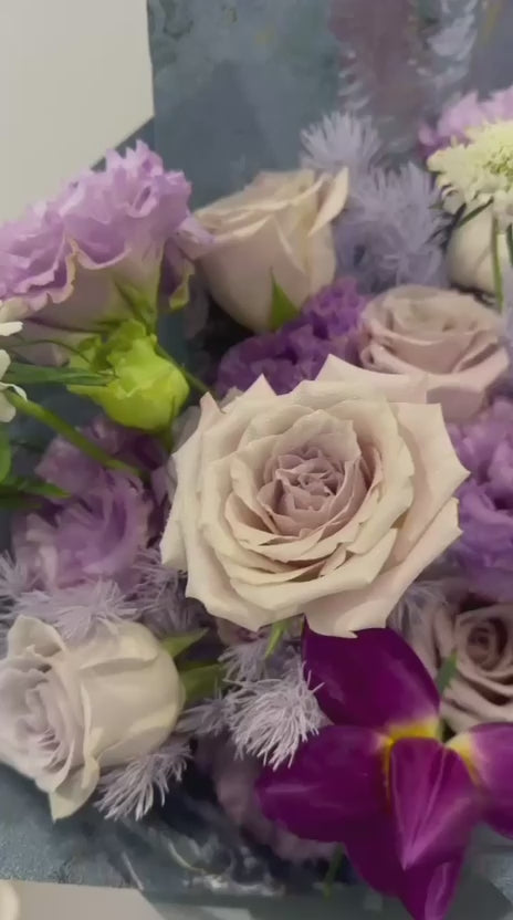 • Featuring ash-lavender roses, lilac lisianthus, dusty mauve blooms and deep plum alstroemeria — forming a sophisticated palette of cool purples, misty greys and rich jewel tones.