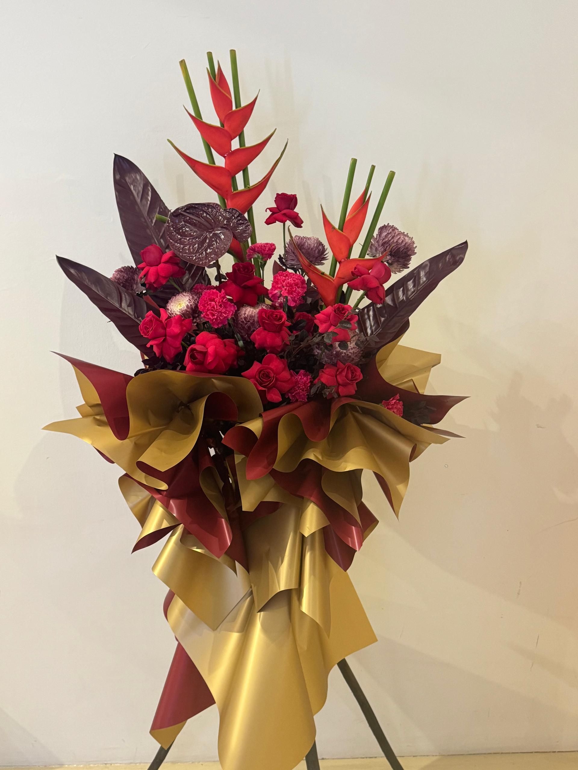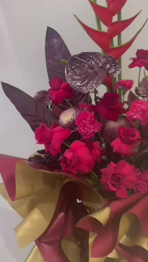 • Featuring red roses, heliconia, anthurium and mixed seasonal blooms — bold, sculptural and full of presence.