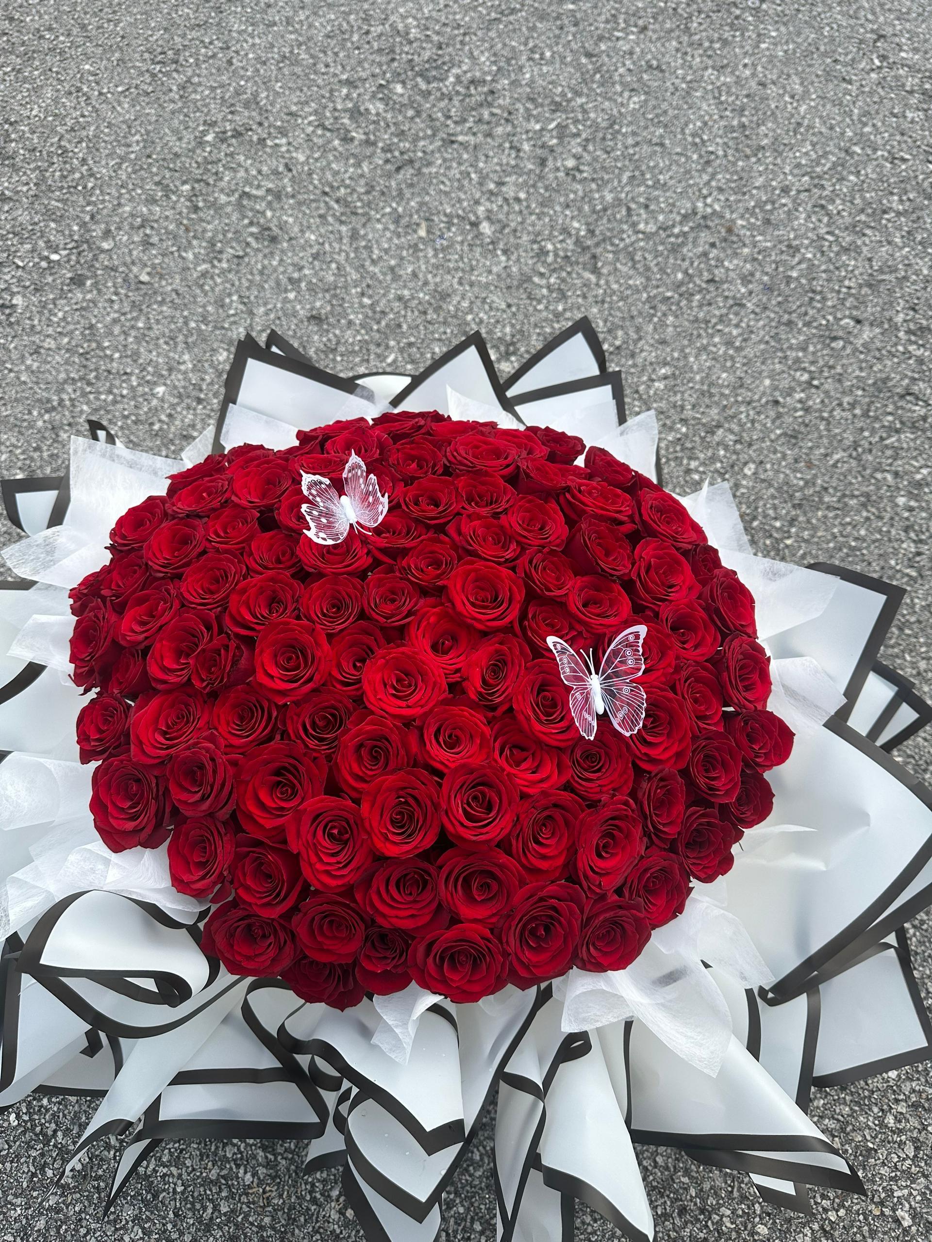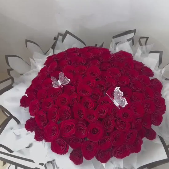 • Featuring 99 premium China roses, arranged densely into a perfect domed silhouette — bold, luxurious and visually breathtaking.