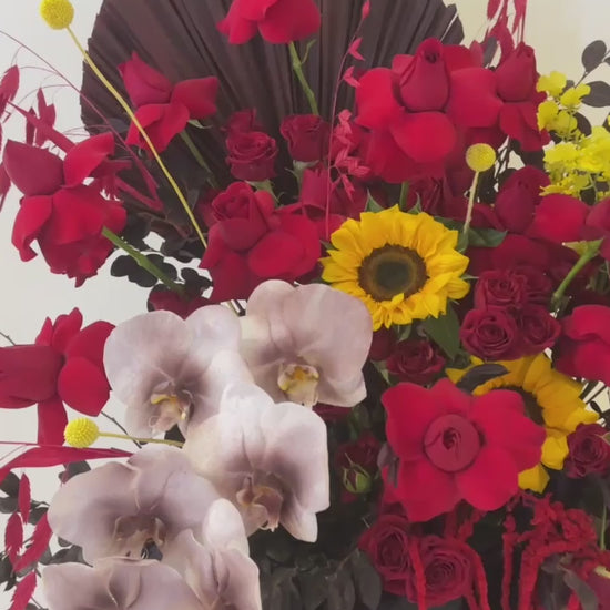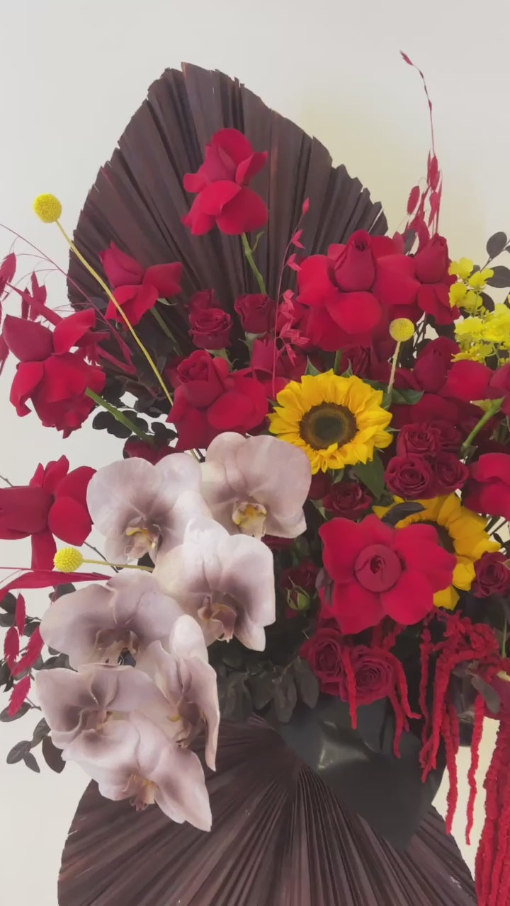 • Hand-arranged with striking red tones, accented by gold and yellow blooms for a bold, celebratory visual impact.