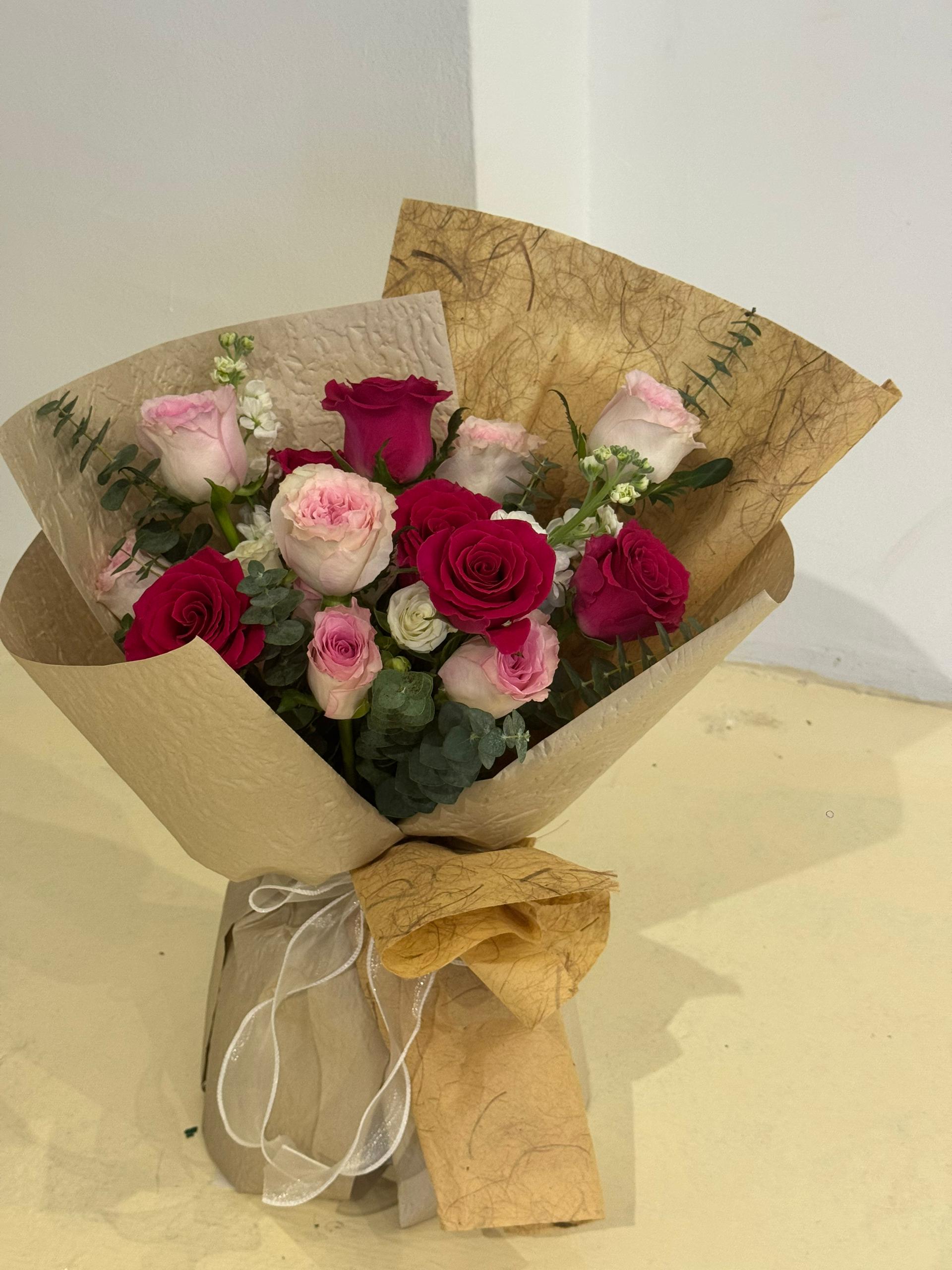 A vintage-inspired bouquet in shades of pink and red, exuding elegance and everlasting allure. The blend of romantic tones and classic blooms captures a sense of warmth, passion, and nostalgia — a perfect choice for expressing deep affection with a touch of timeless grace.