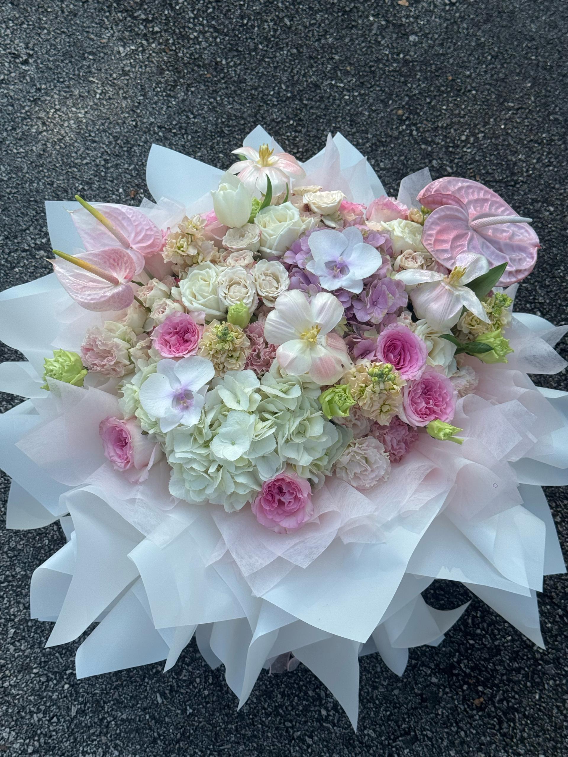 A grand pink bouquet that speaks the language of softness and affection. With layers of delicate pink blooms, it captures the essence of grace, love, and warmth — a perfect gesture for someone who brings light and gentleness into your life.