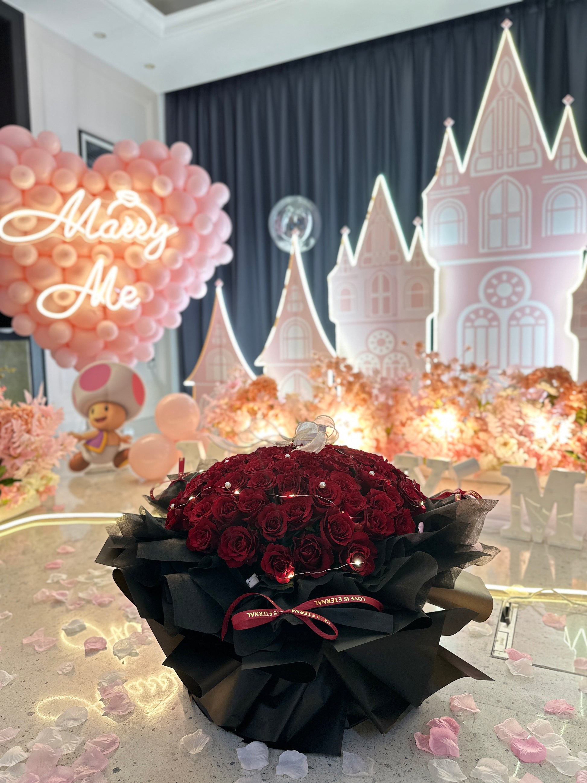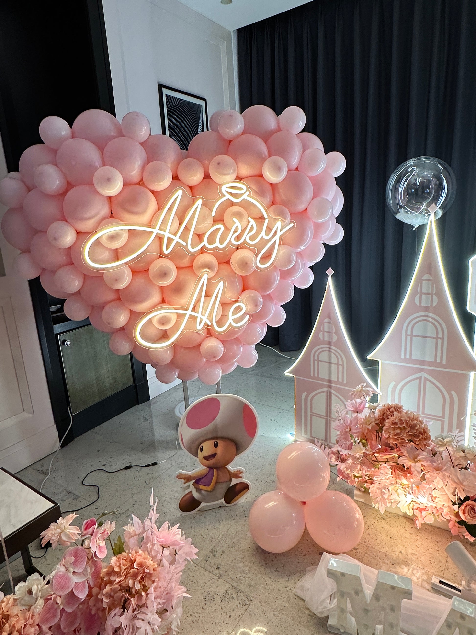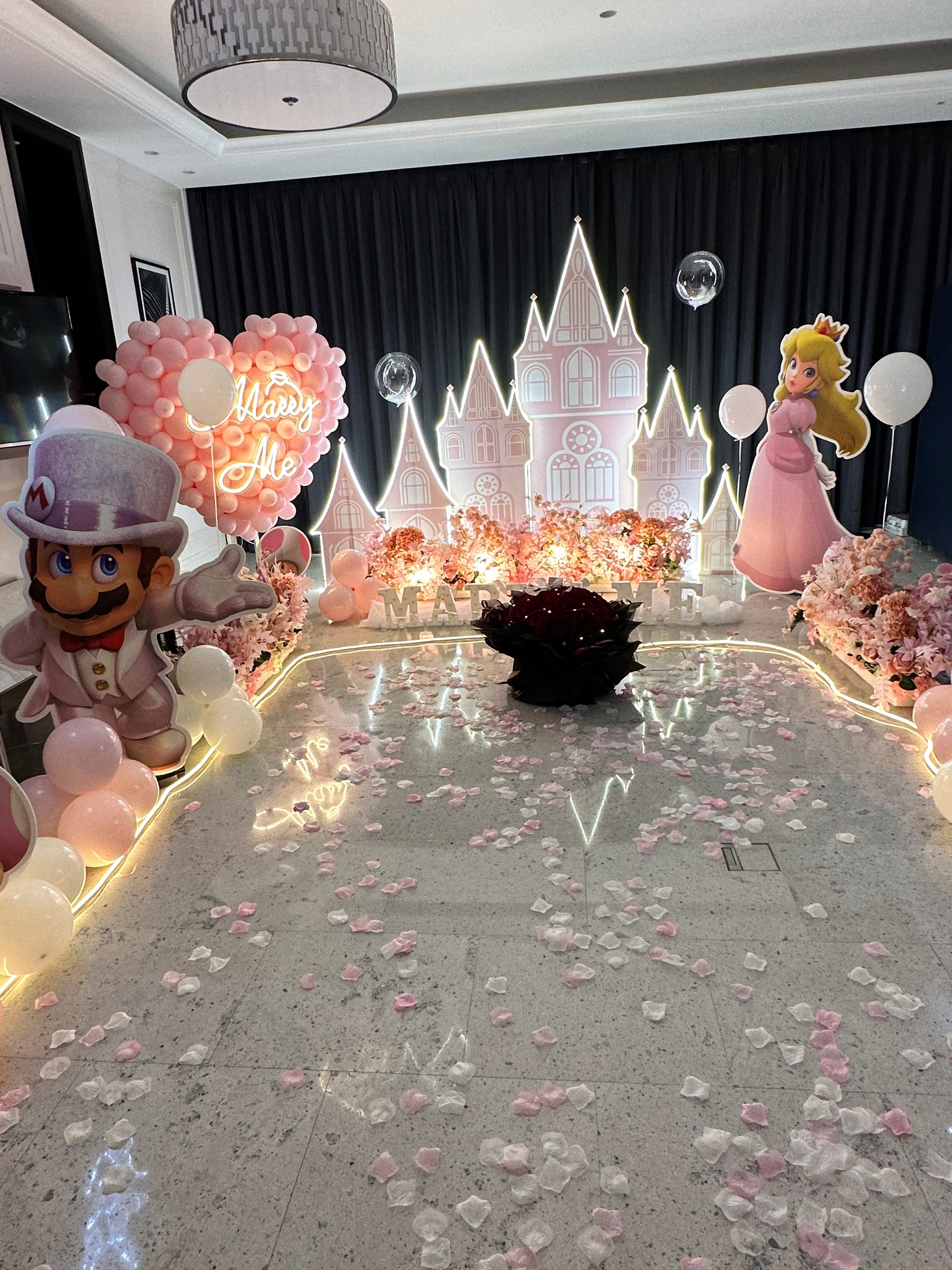 Step into a world of fun and love with this Mario-themed celebration setup. Blending playful adventure with romantic touches, it brings the iconic Mario world to life in a whimsical and heartwarming way — perfect for birthdays, proposals, or couple surprises.