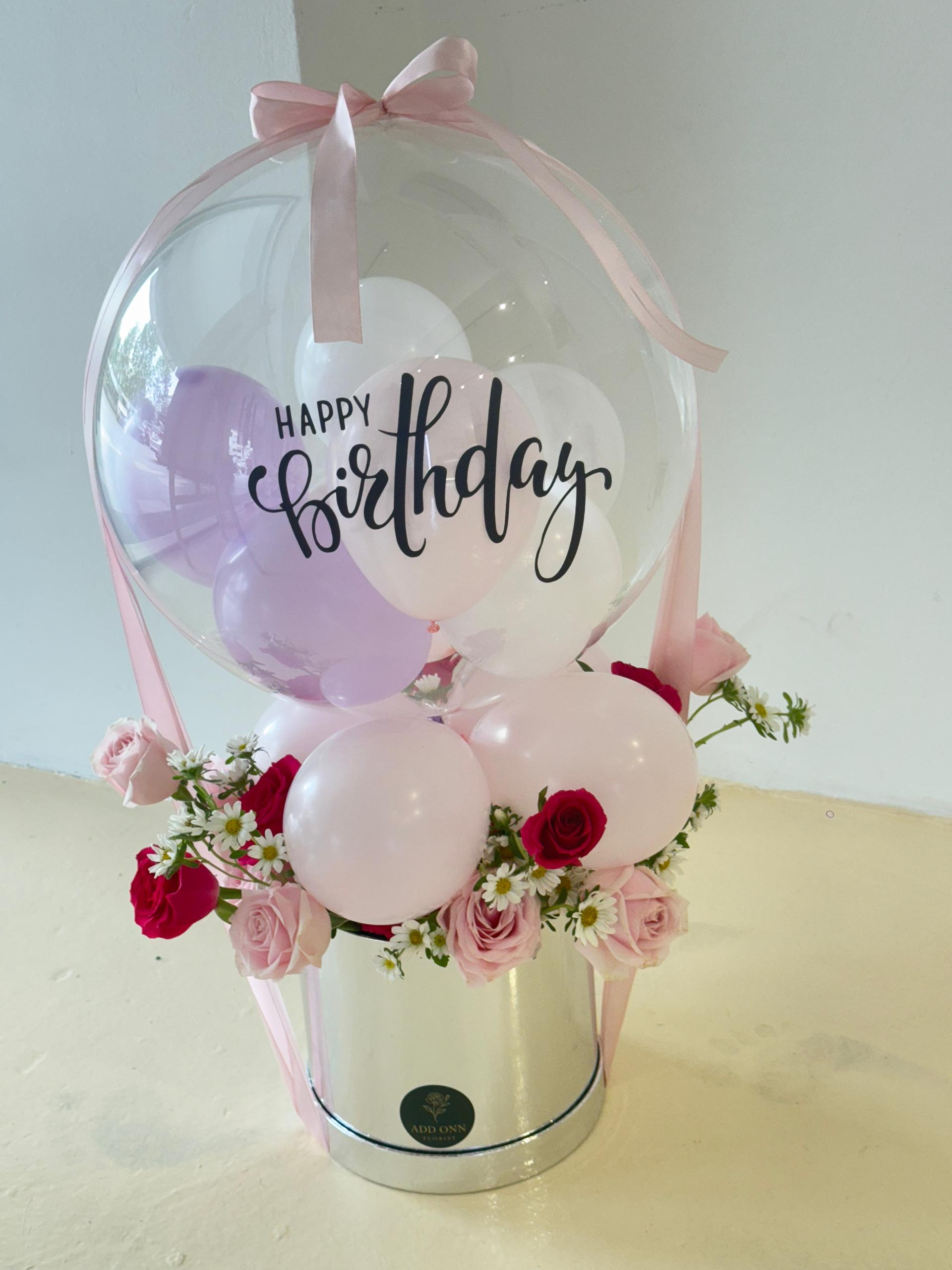 A cheerful helium balloon basket that combines celebration, prosperity, and heartfelt wishes. Decorated with elegant blooms and money notes, it symbolizes abundance, happiness, and good fortune. Perfect for birthdays, milestones, or any occasion that deserves a joyful surprise.