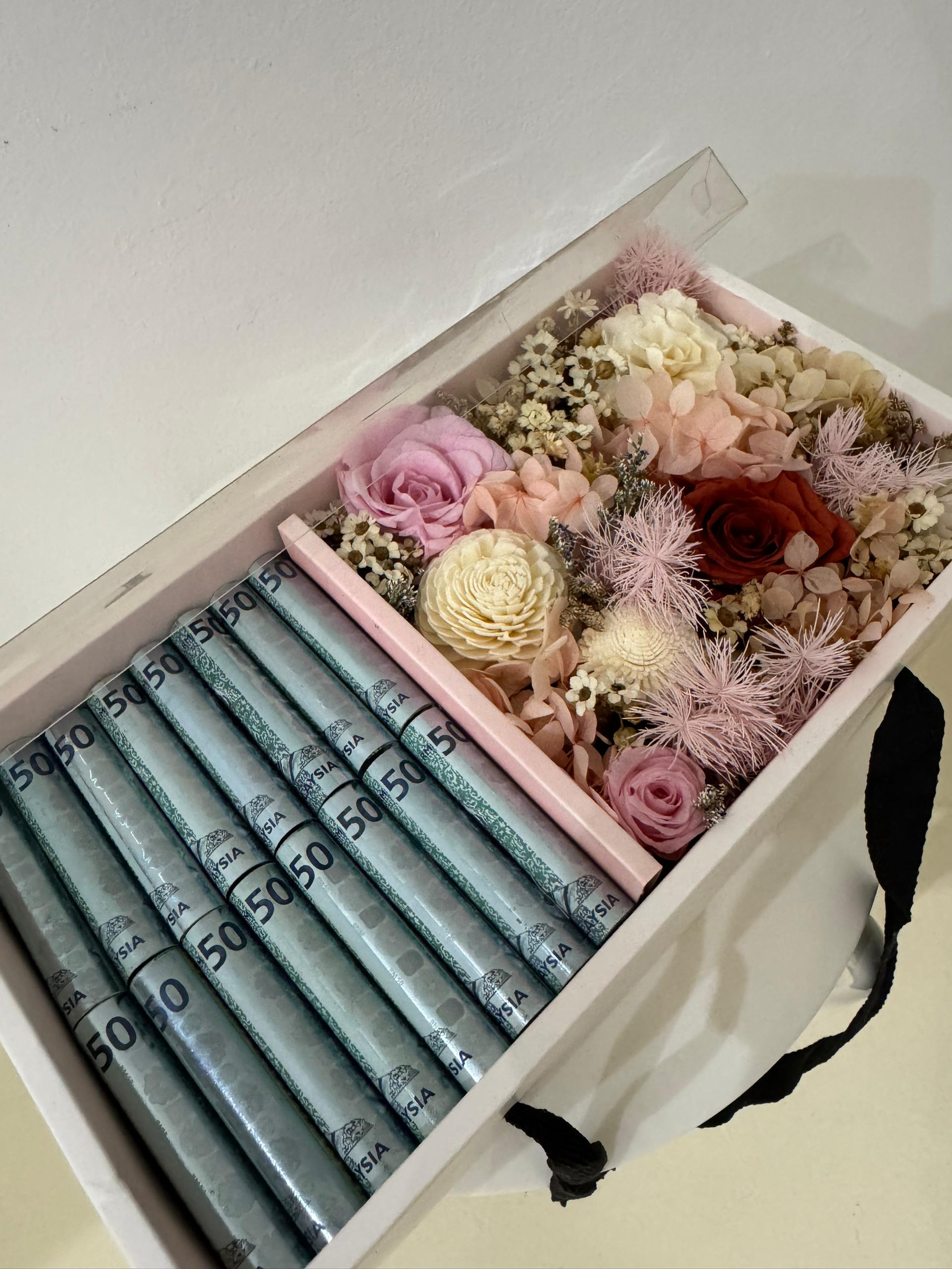 An elegant fusion of beauty and fortune — this money and flower gift box represents blessings of prosperity, elegance, and heartfelt appreciation. Fresh flowers paired with cash notes create a graceful expression of love and good wishes. Perfect for birthdays, anniversaries, or meaningful gifting to convey both affection and abundance.