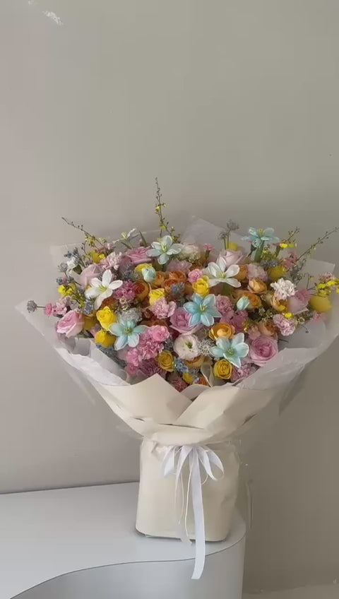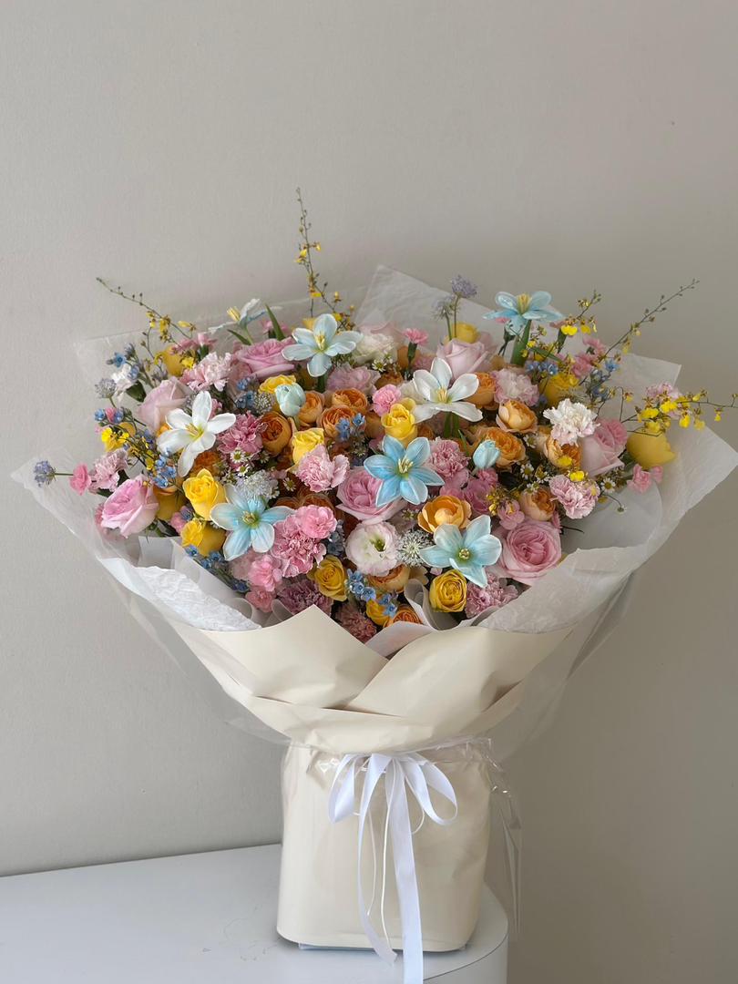 • 粉玫瑰、暖黄色花材与淡蓝点缀交织,色彩层次丰富。