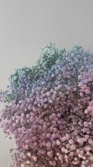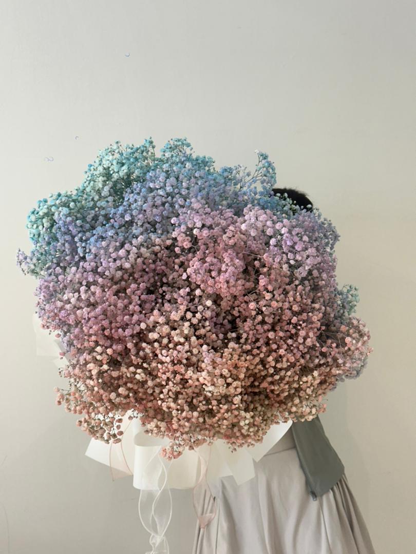 • Pastel ombré baby’s breath — shifting from mint blue to lilac, blush and rose tones, resembling a galaxy of floating stars.