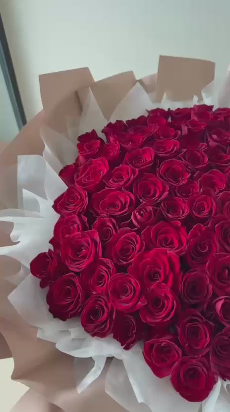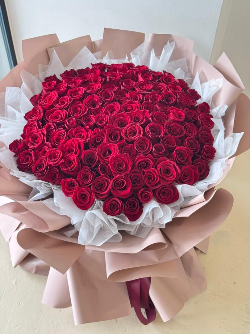 ● Features deep red roses as the main flower, densely packed for a bold, luxurious look