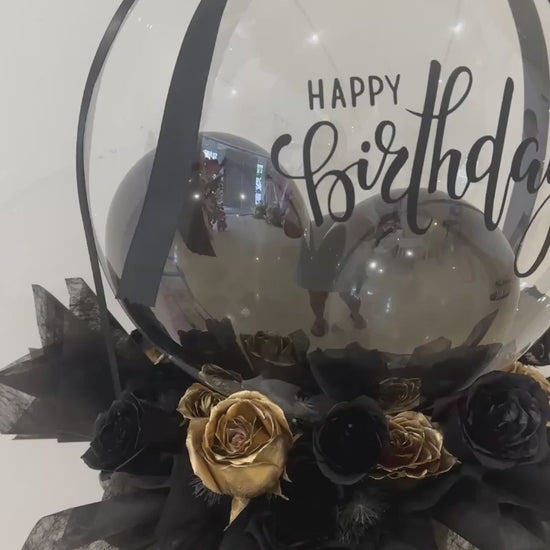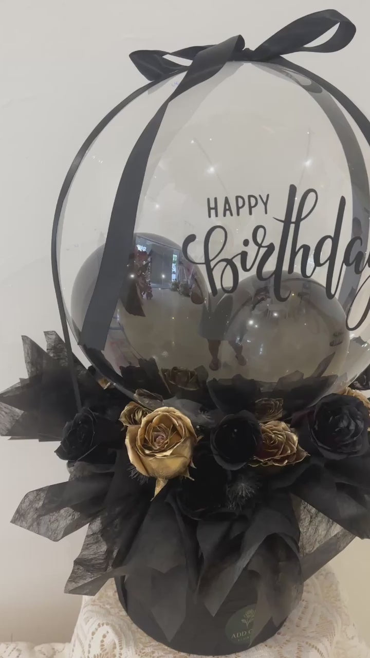 • Accented with premium black and gold preserved roses, symbolising power, elegance and timeless celebration.