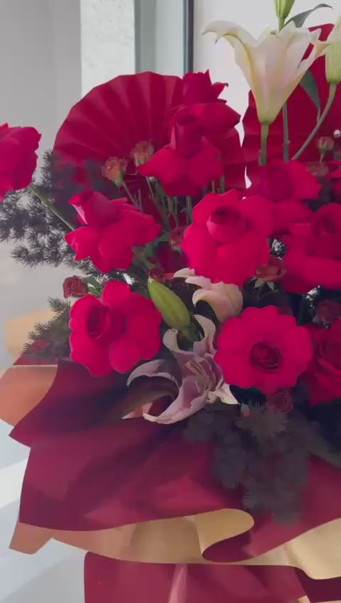 • Main blooms: red roses and pink-white lilies, representing joy, honor, and success.