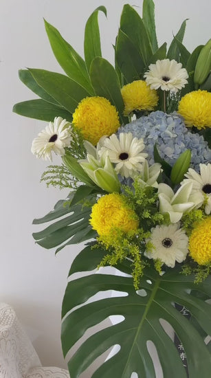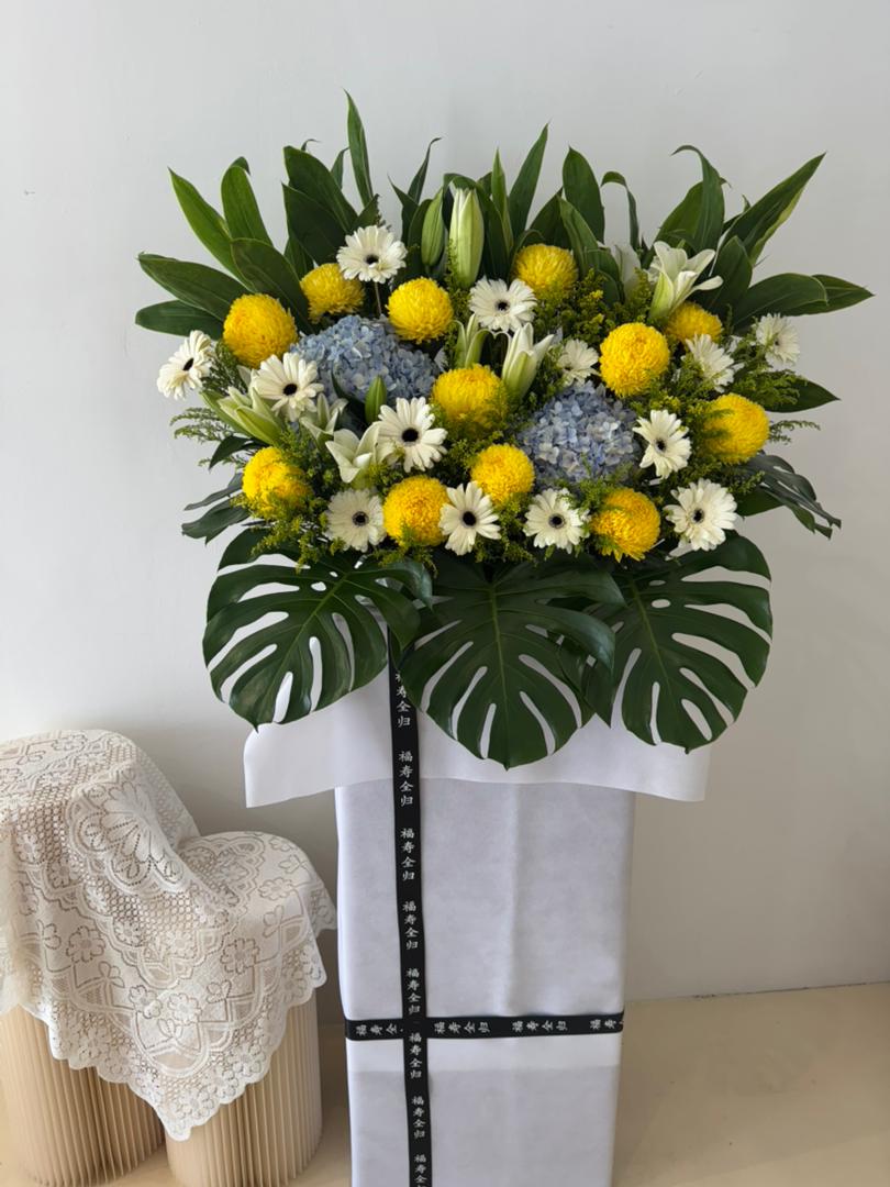 • Featuring white lilies and chrysanthemums symbolising purity and remembrance.