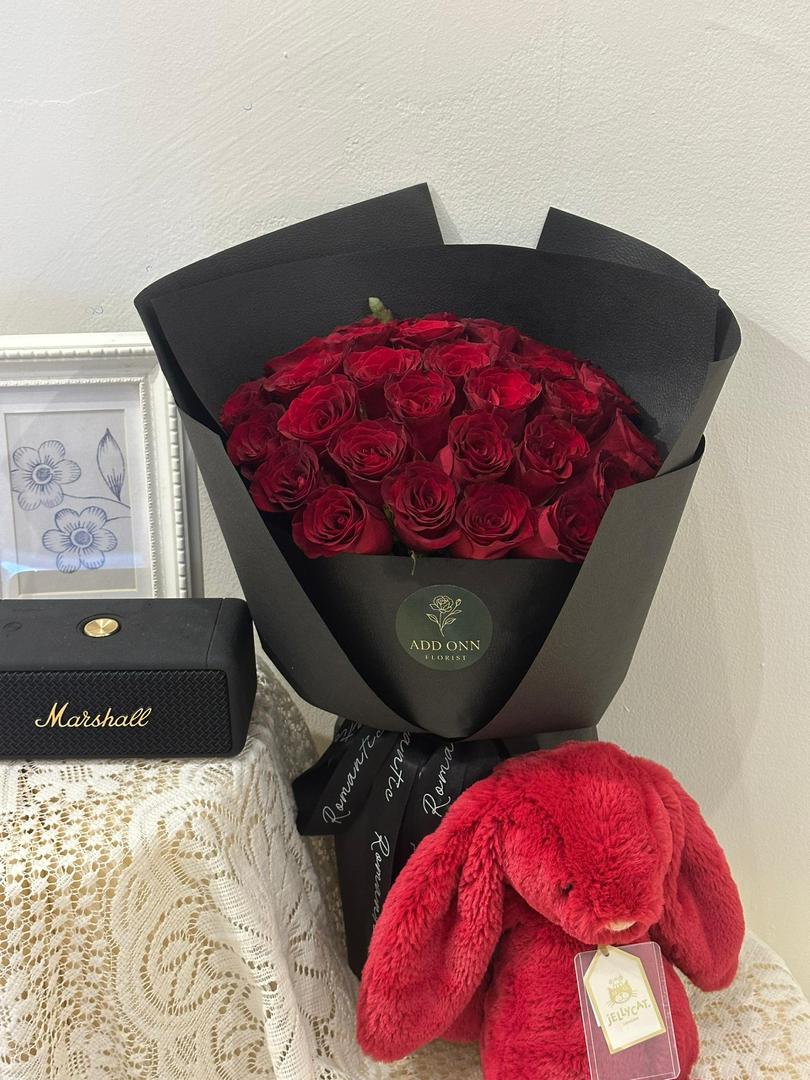 • 30's Premium imported red roses symbolize love, passion, and everlasting devotion