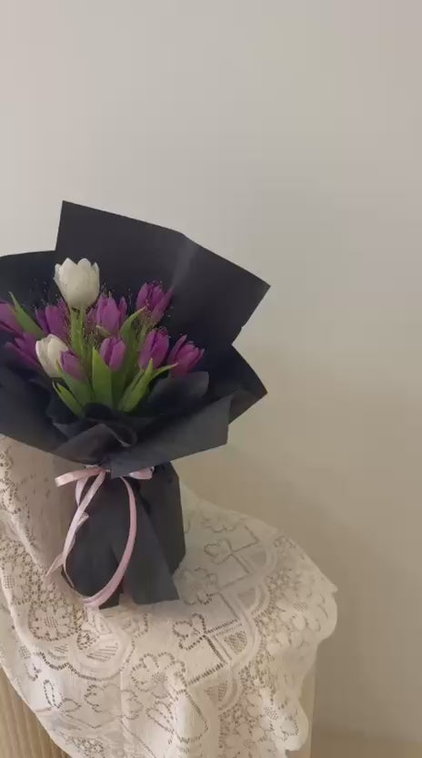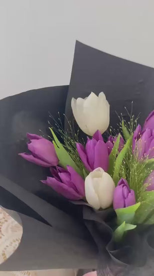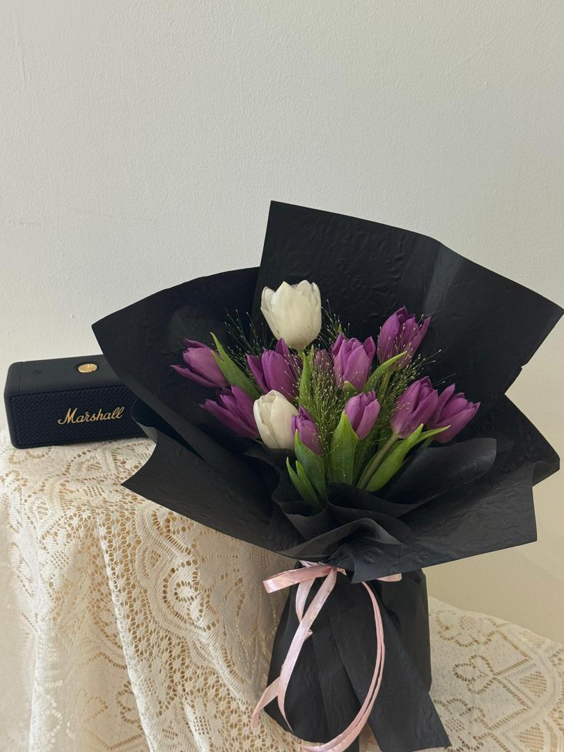• 主花选用紫色与白色郁金香,象征高贵、纯洁与永恒的爱